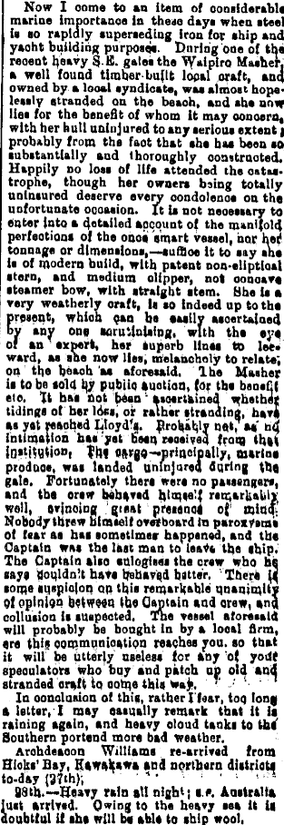 Now I come to an item of considerable marine importance in these days when steel is so rapidly superseding iron for ship and yacht building purposes. Daring one of the recent heavy fi.E. gales the Waipiro Masher, a well found timber bu(lt local craft, and owned by a local syndicate, was almost hopelessly stranded on the beach, and she now lies for the benefit of whom it may oonoern, with her hull uninjured to any serious extent) probably from the fact that she has been so substantially and thoroughly constructed. Happily no lose of life attended the catastrophe, though her owners bsing totally uninsured deserve every condolence on the unfortunate occasion. It is not necessary to enter into a detailed account of the manifold perfections of tbe ones smart vessel, nor her tonnage or dimensions,—suffice it to say she is of modern build, with patent non-eliptioal stern, and medium clipper, not concave steamer bow, with straight stem. She is a very Weatherly craft, is so indeed up to the present, which pan bs easily ascertained by any one scrutinising, with ths eye of an ' expert, her Superb lines to leeward, as she now lies, melancholy to relate', on the beach as aforesaid. The Masher is to be sold fiy public auction, for the beoefll etc. It has not bden ' ascertained whether tidings of bar Ides, or rather stranding, have as yet reached Lloyd’s. Brokafily net, as nq intimation baa yet fiesq received from tfin iostßflliobt thf O»rgo—principally, marina produce, was landed uninjured during thq gale. Fortunately there were no passengers, and tbe crew behaved filmee't remarkably well, evincing gtaat presence o( mindNobody threw himself overboard in parox vein* ot tear as has sometimes happened, and the Captain wm the last man to leaVs the ship. The Captain also eulogises the crew who his says Boqldn’t have behaved better. Thera i( some suspicion on this remarkable unanimity ot opinion between (be Captain and crew, and collusion is suspected. The vessel aforesaid will probably be bought in by a local firm, ere this communication reaches you. so that it will be utterly useless for any of yodf speculators who buy and patch up old and stranded craft to come this Waj>, In conclusion of this, rather I'fear, too long a letter, I may casually remark that it ia raining again, and heavy cloud tanks to the Southern portend more bad weather. Archdeacon Williams re-arrived from Hicks' Bay, Hawakawa and northern districts to-day (37th); 98th.—Heavy rain all night; as. Australia lust arrived. Owing to the heavy asa it ia doubtful if aha will be able to ship wool.