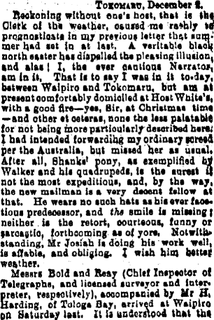 Toxomau, December 9. Beckoning without one's host, that is the Clerk of the weather, caused me rashly id prognosticate in my previous letter that aummet fiad set |n at lest, A veritable black north saster has dispelled tbe pleasing illusion! and alas | I, the ever cautious Narrator, am In it, That is to say I was in it to-day, between Waipiro and Tokomara, bat am at preMntcomfortebly domiciled at Host White's, with a good fire—yes, Sir, at Christmas time —and other st cetarae, none the Ism palatable lor not being more particularly desoribed here; [ had intended forwardihg my ordinary screed per the Australia, but missed her as usual. After all, Shanks 1 pony, as exemplified bj Walker and hia quadrupeds, is tbs surest it not the most expeditious, and, by the way, the new mailman is a very decent fellow at that. He wean no such hats as bis evsr facetious predecessor, and the smile is missing | neither is the retort, courteous, tunny or Sarcastic, forthcoming as of yore, Notwithstanding, Mr Josiah ia doing his work well, is affable, and obliging. I wish him bsttef weather. Messrs Bold and Reay (Chief Inspector of Telegraphs, and licensed surveyor and inter. prater, respectively), accompanied by Mr H, Harding, ot Tologa Bay, arrived al Waipiro OA Saturday lest. It la understood that ths