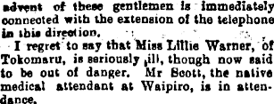 advent of Ibese gentlemen is immediately connected with the extension of the telephone in this direction. I regret’to say that Miss Lillie Warner, of Tokomsru, is seriously t ill, though now said to be out of danger. Mr Scott, the native medical attendant at Waipiro, is in attendance.