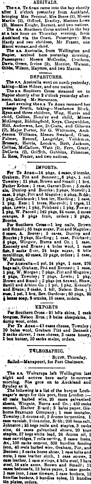 ARRIVALS. The s.s. Te Anau came into the bay shortly liter 1 o’clock yesterday from Auckland, bringing Mrs Percival, Mrs Beere (2), Misses Martin (2), Gifford, Bradley, Masters Lowe (2). Messrs Knight, Barnett, and two native?. The s.B. Southern Cross arrived in the bay It a late hour on Thursday evening, from Auckland via the Coast. Passengers: Mrs Hardy and two children, Mr Fraser, one Maori woman.and child. The s.B. Australia, from Wellington and Napier, arrived here yesterday morning. Passengers: Messrs McCredie, Ou there, Davis, Green, Irvine (2), Morrice, Watson, Gibbs, Wilson, Haymes, and two Maoris. DEPARTURES. The s.?. Australia went on north yesterday, taking—Miss Milner, and one native. The a. 8. Southern Cross steamed on to Napier shortly after 2 o’clock yesterday afternoon, taking Mr Htevenson. Last evening thes.s. Te Anau resumed her passage South, taking—Mesdames Bhck. Ryan and three children, Wug, Harri* and child, Collins, Flenz’er and child, Misses McGregor, Biddingfield, Keys, Chegwidden, Hill, Andrewes, Lee, D-.Coata, and Gibsons (2), Major Porter, Sir G. Whitmore, Arch deacon Williams, Messrs Swaland, Glass, Palmer, Renouf, Langridge, Volckmin, Brassey, Harris, Locck'e, Butt, Jackson, Collins, McCallum, Watt (2), Fern, Grant, (2), Griffith, Gubbins, Primrose, L. Rees, Frazer, and two natives. IMPORTS. Per Te Anau—l4 pkgs, 4 cages, 2 trunks, Graham, Pitt and Bennett;,6 pkg?, 1 roll Townley; 11 pkgs, Brown and Smaill ; 1 box. Father Kehoe ; 1 case, Garrett Bro?.; 5 casks ale, Dunlop and Bourke ; 2 pkgs, Morrell; 1 case, 2 pkgs, Pitt and Maguire; 4 pkga, Rjfeb; 1 pkg, Colebrook; 1 box ice, Harding; 1 case, 1 pkg, East; 1 truss. Matcroft; 1 taps, 11 pkgs, Lewis; 1 pkg, Prichard ; 1 pkg, Foster; 1 pkg, W. Parnell; 149 pkgs, 24 oases. 5 eases oranges, 8 pkgs fruit, orders ; 2 pkgs, Brooke, Per Southern Cross—l keg nails, Brown and Smaill; 58 bags sugar, Pitt and Maguire; 6 eases, A. Beeves; 5 ca.es, Dunlop and Bourke ; 3 pkgs, Harding; 1 case, Pilchard ; 5 pkgs, Wingate, Burna and Co. ; 1 case, Kennedy and Evans; 4 bales wool, 1 case fish, 3 sacks fl >ur, 24 bags sugar, 8 bdle mouldings, 40 cases, 19 pkgs, orders ; 1 case, W. Parnell. Per Australia—l pci. 24 pkgs, 1 case, 276 bags salt, Graham, Part and Bennett ; 1 ease, 1 Pkg> W. Morgan ; 7 pkgs, Pitt and Maguire; 6 pkgs, Townley; 7 pkgs, Lewis; 1 pkg, Brown and Smail'; 5 pkgs (ex Arawa), Shaw, Savill and Albion Co. ; 1 pci, 1 pkg, Kennedy and Evans; 3 casks, 1 bdl, Nelson Bros.; 1 ease, 1 pel, 1 box, Bev. Gardiner; 80 pkgs, 20 1 boxes soap, 8 trunks, 10 oases, orders. EXPORTS Par Southern Cross - 91 bdls skins, 1 cask tongues, Nelson Bros.; 3 bales sheepskins, 1 dump wool, order. Per Te Anau—43 eases cheese, Townley ; 10 bales wool, Graham Pitt and Bennett; 2 aacks clover, 1 case cheese, 3 oases houey, 1 box butter, 10 sacks maize, orders, TELEGRAPHIC. Birrs’, Thursday. Sailed—Manapouri, tor Port Chalmers. The s.s. Wairarapa left Wellington last night and arrives here early to-morrow morning. Rhe goes on to Auckland and Syndey at 9. The following is a list of the barque Loohnagar’s cargo for this port, from London :— 40 reels barbed wire, 20 cases galvanised sheets, Wingate, Burns and Co.; 450 casks cement. Harbor Board; 3 ba'es paper. Gisborne Standard Company; 1 case mangles, Townley; 3 drums oil, 2 drums tu-pentine, 1 ease varnish, 2 tins color, Bobb; 200 bags salt, Johnston ; 35 kegs nails and staples, 3 casks zine, 44 cases galvanised sheets, 20 kegs staples, 57 kegs white lead, 24 drums oil, 1 Case cartridges, 7 rolls netting, 2 cases locks, Ao., 100 casks cement, 300 bundles fencing iron, 40 reela barbed wire. Graham, Pitt, and Bennett; 3 casks horse shoes, 1 case bolts and nuts, 1 case leather doth, 1 case screws, 1 case leather. 1 case strings, 4 bdls steel, 7bars steel, 18 axle arms. Brown and Smaill; 11 cases bedsteads, 13 bales paper, 1 case goods. 1 ease iron, 1 case tinware, 1 case buckets, 12 bundles buckets, 9 bundles tubes, 11 bundles tin pistes, orders.