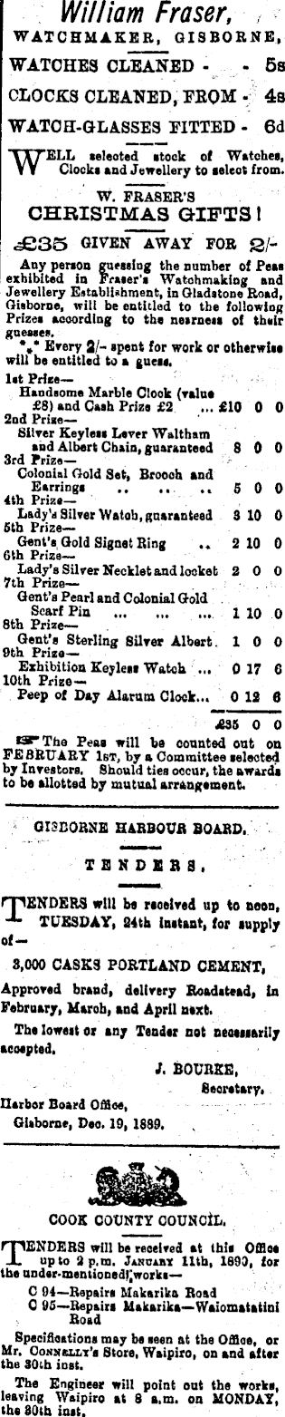 William Fraser, WATCHMAKER, GISBORNE, WATCHES CLEANED - - 5s CLOCKS CLEANED, FEOM - 4s WATCH-GLASSES FITTED - 6d WELL selected stock of Watches, Clocks and Jewellery to select from. W. FRASER’S CHRISTMAS GIFTS I j£3o given AWAY FOR 2/’ Any person guessing the number of Peas exhibited in Fraser's Watchmaking and Jewellery Establishment, in Gladstone Road, Gisborne, will be entitled to the following Prizes according to tbe nearness of their guesses. V Every 2/- spent for work or otherwise will be entitled to a guess. Ist Prize— Handsome Marble Clock (value £8) and Cash Prize £2 ... £lO 0 0 2nd PrizeSilver Keyless Lever Waltham and Albert Chain, guaranteed 8 0 0 3rd Prize— Colonial Gold Set, Brooch and Earrings ~ .. .. 5 0 0 4th Prize— Lady’s Silver Watob, guaranteed 310 0 6th PrizeGent's Gold Signet Ring .. 210 0 6th Prize— Lady’e Silver Necklet and locket 2 0 0 7th Prize— Gent’s Pearl and Colonial Gold Scarf Pin 1 10 0 Bth Prize— Gent's Sterling Silver Albert 10 0 9th Prize— Exhibition Key less Watch ... 017 6 10th Prize — Peep of Day Alarum Clock... 012 6 £35 0 0 The Peas will ba counted out on FEBRUARY Ist, by a Committee selected by Investors. Should ties occur, the awards to be allotted by mutual arrangement. GISBORNE HARBOUR BOARD. TENDERS. r l l LENDERS will be received up to noon, TUESDAY, 34th instant, for supply of—--3,000 CASKS PORTLAND CEMENT, Approved brand, delivery Roadstead, in February, March, and April next. The lowest or any Tander not necessarily acospted, J. BOURKE, Secretary, Harbor Board Office, Gisborne, Deo. 19, 1889, i COOK COUNTY COUNCIL. TENDERS will be received at this Office upto 2p.m. Januaby 11th, 1890, for the under-mentionedljworks— C 94—Repairs Makarika Road 0 95—Repairs Makarika—Waiomatatini Road Specifications may bs seen at the Office, or Mr. Oonnslly’s Store, Waipiro, on and after the 30ih fast. The Engineer will point out the works, leaving Waipiro at 8 a.m. on MONDAY, the 80th inst.