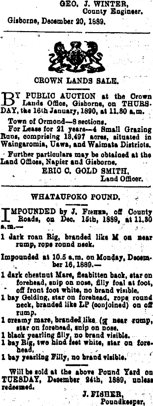 GEO. J. WINTER, County Engineer. Gisborne, December 30,1889. CROWN LANDS SALE. BY PUBLIC AUCTION at the Crown Lands Office, Gisborne, on THURSDAY, the 16th January, 1890, at 11.80 a.m. Town of Ormond—B sections. For Lease for 31 years—4 Small Grazing Runs, comprising 18,497 acres, situated in Waingaromia, Uawa, and Waimata Districts. Further particulars may be obtained at the Land Offices, Napier and Gisborne. ERIO C. GOLD SMITH, Land Officer. WHATAUPOKO POUND. IMPOUNDED by J. Fisbbb, off County Roads, on Dec, 15tb, 1889, at 11,30 a.m.— 1 dark roan Big, branded like M on near rump, rope round neck. Impounded at 10.5 a.m. on Monday, December 16,1889— 1 dark chestnut Mare, fleabitten back, star on forehand, snip on nose, filly foal at foot, off front foot white, no brand visible. 1 bay Gelding, star on forehead, rope round neck, branded like LP (conjoined) on off' rump, 1 creamy mare, branded like (a neat rump, star on forehead, snip on nose. 1 black yearling filly, no brand visible. 1 two hind feet white, star on fore--1 bay yearling Filly, no brand visible. Will be sold at tbs above Pound Yard on TUESDAY, December 24th, 1889, unless redeemed. J. FISHER, Poundkeeper,