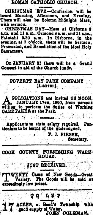 BOMAN CATHOLIC CHURCH. CHRISTMAS EVE—Confession will be heard Morning, Afternoon, and Evening. There will also bo Solemn Midnight Mass, with sermon. CHRISTMAS DAY—Mass at Gisborne 9 a.m. and 11 s.m,,OrmondBa.m.andlla.m- l Patutahi 9.30 a.m. In Gisborne, in the evening, at 7 o’clock, there will be Sermon, Procession, and Benediction of the Most Holy Sacrament, Oa JANUARY 31 there will ba a Grand Concert in aid of the Church funds, POVERTY BAY PARK COMPANY [LlKttlD], Applications bm invited tin noon, JANUARY 17rx, 1890, from persona willing to perform the duties of working CABETAKEB at the Park. Applicant! to state salary required. Par. Honiara to be learnt of ths undersigned. > f. J. PIESSE, Secretary. COOK COUNTY FURNISHING WAREHOUSE. JUST RECEIVED. TWENTY Cam of New Goods— Great Variety, Tbe Goode will be sold at azooedingly low prices. tq m •4 AOBEB. at Bead's Township with 17