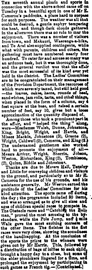 The seventh annual pionic and sports in connection with tho above school came off on Tuesday in a beautiful spot in one of Mr E. Cameron's paddocks, a place hard to surpass for such purposes. Tba weather was all that could be desired, a gentle zephyr tempering the heat, and though dark clouds gathered in the afternoon there was no rain to mar the enjoyment. There was a number of visitors from town, and Makauri, Waerenga-a-hika, and Te Arai also supplied contingents, while what with parents, children and others, the gathering must have numbered nearly four hundred. To cater for and amuse eo many w«s an arduous task, but it was thoroughly done, and the general verdict was that the affair was the most successful of its kind ever yet held in the district. The Ladies’ Committee are to ba congratulated on their management of the Provision Department, the reeouroM of which wore severely taxed, but still held good —the loaves, cakes, hams, rounds of beef, sand wiohes, jam rolls, tarts, and othel things, when placed in the form of a column, say 4 feet square at the boss, and raised a certain number of feet, say 10, gives but a loose approximation of the quantity disposed of. Among those who took a prominent part fat the affair, aud “ helped the thing ” along, were—Mesdames Walsh, Dunne, Johnstone, King, Bright, Wright, and Harris, and Misses Mackie, Johnstone (3), Greene (2), Wright, Caldwell (2), Cameron, and King (2.) The undernamed gentlemen also worked hard to promote the enjoyment of allMessrs Arthur, Wright. Sherrin, Jobson, Weston, Riohardson, King (2), Tombleson, (2), Quinn, Biddle and Johnstons. Thanks are due to Moisrs Hall, Tshtley and Little for conveying children and visitors to the ground, and particularly so to Mr E. Cameron for the use of his grounds, and hi* assistance generally. Mr Weston earned tho gratitude of the Ladies' Committee for his kind attention. Ths sports oams off during the day ; the programme included 80 items, and was so arranged *s to give all slaas and ages of children special races to compote in. The Obstacle races and “ Catohidjj the qvli; man,” proved ths most amusing to ths h»« standsrs, while ths Pols Jump, and" J mil* Walk gavs the most exalting oonteeto ot the other items. Ths finishes ia the flat races were very close, showing tho souadnee* of the handicapping. At the conclusion of the sports the prises to the winners wer* given out by Mr Harris. This, followed by a distribution of bags of lollies to'sack ol)lld> brought a happy day to a close, but some of the elder plonlokere lingered for a time, and prolonged the enjoyment by partioipaUM In such games as French tig.— [Contributed,]