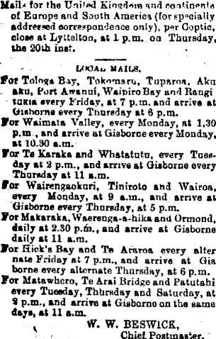 Mail-* for the United Kingdom and continents of Europe and South America (for specially addressed correspondence only), per Coptic, close at Lyttelton, at 1 p.m. on Thursday, the 20th inst. 1/>OAu mails. For Tolnga Bay, Tokomsru, Tuparoa. Aka aku, Port Awsnui, Waipiroßay and Raugi taxia every Friday, at 7 p.m. aud arrive at Gishorne every Thursday at 6 p.m. For Waimata Valley, every Monday, at 1,30 p.m , and arrive at Gisborne every Monday, at 10.30 a.m. For Te Karaka and Whatatutu, every Tuesday at 2 p.m., and arrive at Gisborne every Thursday at 11 a.m. For Wairengaokuri, Tiniroto and Wairoa, every Monday, at 9 a.m., and arrive at Gisborne every Thursday, at 5 p.m. For Makaraka, Waerenga-a-hika and Ormond, daily at 2.30 p.m., aud arrive at Gisborne daily at 11 a.m. For Hick’s Bay and Te Araroa every alter nate Friday at 7 p.m., aud arrive at Gia borne every alternate Thursday, at 6 p.m. For Matawhcro, Te Arai Bridge and Patutahi every Tuesday, Thursday and Saturday, at 2 p.m., and arrive at Gisborne on the same days, at 11 a.m. W. W. BESWICK, Chief Postmaster.