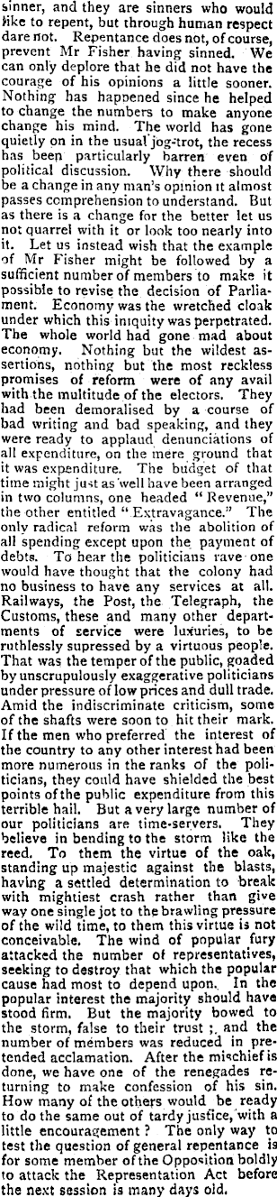 sinner, and they are sinners who would like to repent, but through human respect dare not. Repentance does not, of course, prevent Mr Fisher having sinned. We can only deplore that he did not have the courage of his opinions a little sooner. Nothing has happened since he helped to change the numbers to make anyone change his mind. The world has gone quietly on in the usual jog-trot, the recess has been particularly barren even of political discussion. Why there should be a change in any man’s opinion it almost passes comprehension to understand. But as there is a change for the better let us no: quarrel with it or look too nearly into it. Let us instead wish that the example of Mr Fisher might be followed by a sufficient number of members to make it passible to revise the decision of Parliament. Economy was the wretched cloak under which this iniquity was perpetrated. The whole world had gone mad about economy. Nothing but the wildest assertions, nothing but the most reckless promises of reform were of any avail with the multitude of the electors. They had been demoralised by a course of bad writing and bad speaking, and they were ready to applaud denunciations of all expenditure, on the mere ground that it was expenditure. The budget of that time might just as 'well have been arranged in two columns, one headed “ Revenue,” the other entitled “ Extravagance.” The only radical reform was the abolition of all spending except upon the payment of debts. To hear the politicians rave one would have thought that the colony had no business to have any services at all. Railways, the Post, the Telegraph, the Customs, these and many other departments of service were luxuries, to be ruthlessly supressed by a virtuous people. That was the temper of the public, goaded by unscrupulously exaggerative politicians under pressure of low prices and dull trade. Amid the indiscriminate criticism, some of the shafts were soon to hit their mark. If the men who preferred the interest of the country to any other interest had been more numerous in the ranks of the politicians, they could have shielded the best points of the public expenditure from this terrible hail. But a very large number of our politicians are time-servers. They believe in bending to the storm like the reed. To them the virtue of the oak, standing up majestic against the blasts, having a settled determination to break with mightiest crash rather than give way one single jot to the brawling pressure of the wild time, to them this virtue is not conceivable. The wind of popular fury attacked the number of representatives, seeking to destroy that which the popular cause had most to depend upon. In the popular interest the majority should have stood firm. But the majority bowed to the storm, false to their trust and the number of members was reduced in pretended acclamation. After the mischief is done, we have one of the renegades returning to make confession of his sin. How many of the others would be ready to do the same out of tardy justice, with a little encouragement ? The only way to test the question of general repentance is for some member of the Opposition boldly to attack the Representation Act before the next session is many days old.