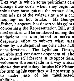 Thk way in which some politicians can change their coats when they begin to think they have got on the wrong side, reminds us of the vulgar, simile of a cat hopping on hot bricks. Mir George Fisher, it appears, has deserted his colors concernifi g the Representation Bill, and next session will be numbered among the audacious set who intend to make a desperate effort to subvert what ’Vas done by a substantial majority after i f ull consideration. The Lyttelton Times, an able and consistent opponent of tiie Act, while still fervent in its opposition, welcomes the renegade in a way which shows that while they despise Mr Fisher for turning his coat they will not scrupla to make use of his misdirected abilities.