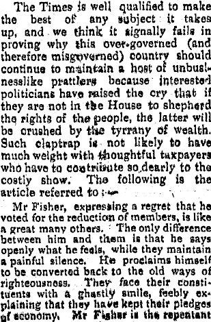 The Times is well qualified to make the best of any subject it takes up, and we think It signally fails in proving why this ovet.governed (and therefore misgoverned) country should continue to maintain a host ot unbusinesslike prattlers because interested politicians have raised the cry that if they are not in t&e House to shepherd the rights of the people, the latter will be crushed by tlie tyrrany of wealth. Such claptrap is not likely to have much weight with thoughtful taxpayers who have to coo tribute so .dearly to the costly show. The following is the article referred to Mr Fisher, expressing a regret that he voted for the reduction of members, is like a great many others. The only difference between him and them is that he says openly what he feels, while they maintain a painful silence. He proclaims himself to be converted back to the old ways of righteousness. They face their constituents with a ghastly smile, feebly explaining that they have kept their pledges a f economy. Mt Fiaher i« the repentant