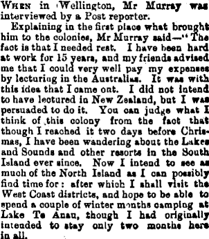 When in Wellington, Mr Murray was interviewed by a Post reporter. Explaining in the first place whet brought him to the colonies, Mr Murray said—“ The fact is that I needed rest. I have been hard at work for 15 years, and my friende advised me that I could very well pay my expenses by lecturing in the Australias. It was with this idea that I came ont. I did not intend to have lectured iu New Zealand, but I was persuaded to do it. You can judge what I think of this colony from the fact that though I reached it two days before Chrismas, I have been wandering about the Lakes and Sounds and other resorts in the South Island ever since. Now I intend to see as much of the North Island as I can possibly find time for: after which I shall visit the West Coast districts, and hope to be able to spend a couple of winter months camping at Lake Te Anau, though I had originally intended to stay only two months hero in all.