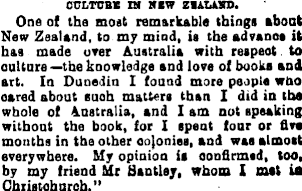 CULTURE IN NSW ZIiHSD. One of the most remarkable things about New Zealand, to my mind, is the advance it has made over Australia with respect to culture—the knowledge and love of books and art. In Dunedin I found mare people who cared about such matters than I did in the whole of Australia, and I am not speaking without the book, for I spent four or five months in the other colonies, and was almost everywhere. My opinion is confirmed, too, by my friend Mr Santley, whom I met ia Christchurch."