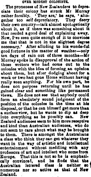 OVER MODEST COLONISTS. The proneness of New Zealanders to depreciate their colony has struck Mr Murray rather forcibly. ‘ They are,' he says, • altogether too self depreciatory. They decry their own country—talk almost apologetically about it, as if there was something about it that needed a good deal of explaining away. Now, I’ve seen quite enough of it to oonvinoe me that that is not in toe slightest degree necessary.' After alluding to hia wonderful good fortune in the matter of weather—only ten days of rain out of three months—Mr Murray spoke in disapproval of the action of those writers who had come ont to the colonies with the idea of forming an opinion about them, but after dodging about for a week or two haa gone Home without having really seen anything. For his own part, he does not purpose returning until he has gained clear and something like permanent views. He does not see that anybody could form an absolutely sound judgment of the position of the colonies in the time at his disposal, or that he can himself get more than a surface view, but he wants to dip as deep into everything as he possibly can. New Zealand audiences seem to him more receptive and kind than Australian audiences, who do not seem to care about what may be brought to them. There ia amongst the Australians a class who think they can get whatever they want in the way of artistic and intellectual entertainment without meddling with any professors of art and intellect who come from Europe. That this is not so he is emphatically convince!, and he finds that ths J Australian lettered class is neither so 1 numerous nor so active as that ot Now ’ Zealand.