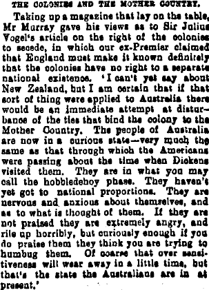 THE COLONIES 4ND THE MOTHER OOUNTXT. Taking up a magazine that lay on ths table, Mr Murray gave hia views as to Sir Julius Vogel's article on ths right of the colonies to secede, in which our ex-Premier claimed that England must make it known definitely that the colonies have no right to a separate national existence. * I can't yet say about New Zealand, but I am certain that it that sort of thing were applied to Australia there would be an immediate attempt at disturbance of the ties that bind the colony to the Mother Country. The people of Australia are now in a curious state—very much the same as that through which the Americans were passing about the time when Dickens visited them. They are in what you may call the hobbledehoy phase. They haven’t yet got to national proportions. They are nervous end anxious about themselves, and as to what is thought of them. If they are not praised they are extremely angry, and rile up horribly, but curiously enough it yoa do praise them they think you are trying to humbug them. Of coarse that over sensitiveneu will wear away in a little time, but that's the stats ths Australians are in at present.*