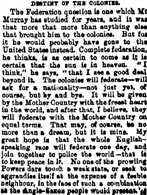 DESTINY OF THE COLOWIIB. The Federation question is one which Mr Murray has studied for years, and it was that more that more than anything else that brought him to the colonies. But for it he would probably have gone to the United States instead. Complete federation, he thinks, is as certain to oome u it is oertaia that the sun is in heaven. "I think,” he says, *' that I see a good deal beyond it. The colonies will federate—will ask for a nationality—not just yet, of oouree, but by and bye. It will he given by the Mother Country with the freest heart in the world, and after that, I believe, they will federate with the Mother Country on equal terms. That may, of oouree, be no more than a dream, but it is mine. My great hope is that the whole Englishspeaking race will federate one day, and join together to police the world—tost is to keep peace in it. No one of the prowling Powers dare touuh a weak state, or seek to aggrandise (tacit at the expanse of a feeble neighbour, in the faoe of such a oomUnetion at the Angle-Saxes petyi* would present,
