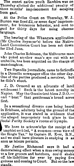 The smart native yonth Rawhira was on Thursday allotted the additional penalty of three months' imprisonment for escaping from gaol. At the Police Court on Thursday, W. J. Burton was fined £2, or seven days’ imprisonment, for boisterous behavior, and sent to gaol for thirty days for using obscene language. The hearing of the Whangara application (Mr Charles Seymour’s) before the Native Land Commission Court has been set down for 23rd June. John Charles Robinson, the Melbourne man who poked another man’s eye out with an umbrella, has been acquitted on the charge of manslaughter. Two Dqnedin journalists, came to fisticuffs in a Dunedin newspaper office the other day. One of the parties produced a revolver, but he didn’t shoot. J. D. Ormond as an advocate of land settlement! Such is the latest novelty in Napier. May the Omniscient bless J.D.O.— and ‘‘bust” that gentleman’s broad acres first. Io a sensational divorce case being heard in Brisbane, adultery being the ground of the application, it was stated in evidence that Lthe alleged impropriety took place in the ISocial Purity Society's rooms at Gympie. B We have to acknowledge the receipt of a Mnmphlet entitled, ” A common-sense view of the Single Tax,” by Captain H. Kerr, 8.N., and we shall have pleasure in studying it as soon as leisure permits. Mr Justice Richmond save it had a demoralising effect when a man owing money to a few grocers and butchers, could shake off his liabilities for ever by paying five guineas and coming to Court. But so the law stands.