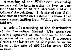 A meeting of the Wellington steamship owners will be held in a day or two to consider the circular of the Mercantile Marine Officers’ Association. It is stated that if the association insists on its demands more than one steamer hailing from Wellington will be laid up. At Adelaide a meeting of the shareholders of the Australian Mutual Life Assurance Society approved of the scheme for the absorption of its business by the T-mperanae Society, the latter issuing new policies calculated at the rate of £92 10s for every £lOO assured.