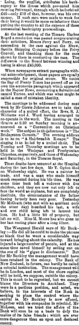 Laing, the pugilist, attributes his bankruptcy to the illness which presented him meeting Pettsngell, through which he forfeited £4o—only £lO of that, however, was his own money. If such men were made to work tor their living it would be more satisfactory than putting the country to all the expense of these nonsensical bankruptcy proceedings. At the last meeting of the Timaru Harbor Board a resolution was passed congratulating lheie solicitors, Messrs Perry and Perry, on succeeding in the case against the Shaw, Saville Shipping Company before the Privy Council, and thanking them for the care shown by them in conducting tbe case. The difference to the Board between winning and losing is about £45,000. When newspapers extract paragraphs without acknowledgment, those papers are equally responsible for original errors. We notice the Bay of Plenty Times has passed off as its own the erroneous paragraph which appeared in the Napier News, concerning a Salvationist named Turton, and which was what might be called a case of mistaken identity. Ths meetings to be addressed during next week by Mr Corrie Johnston are to take the character of a united effort, the Revs. B. J. Williams and J. Ward having arranged to co-operate in the work. The meeting in the theatre at 9.30 on Sunday morning is announced as a “ Convention on Christian work. ” The subject in thejafternoon is “ The Bridegroom Cometh.” Tbe evening address is to be on “ A Hairbreadth Escape." The singing is to be led by a united choir. The Tuesday and Thursday meetings are to be held in the Wesleyan and Presbyterian Churches, respectively,and those of Wednesday and Saturday, in the Theatre Royal. Thtee deaths have occurred at the Hospital during the last few days. Mr T. Ogden died on Wednesday night. He was a painter by trade, and was a man who made himself much respected during his life time. He was some time back left a widower with five children, and they are now not only left to face the world as orphans, but are completely destitute, the circumstances of the father having laiterly been very poor. Yesterday Mr McGrath (who met with an accident only the other day) breathed his last, a wife and one child being left to lament his loss. He had a little bit of property, but left no will. Mies M. Moore has also gone to her last resting place after a long illnee. The Wanganui Herald says of Mr Buckley : —He did all he could to make the picture so black that he went a considerable way toward bringing about the calamity. He has injured a large number of people, and at the same time saved himself by selling out on the eve of his “gigan ic disclosures.” But for Mr Buckley the management would have been retained in the colony. The Bank of New Zealand, in future, oau hardly be called a colonial institution. The management will be in London, and most of the share capital will be held, we suppose, outside the colony. This is much to be regretted, but we cannot blame the Directors in Auckland. They were in a perilous position, and acted, we believe, in the interests of the Bink in seeking to place the control where the capital is. Mr Buckley is now effaced, together with his companion in mischief, Mr McLean, and we trust the affiirs of the Bank will soon be on a basis to defy the malice of its false friends ; which are ever more dangerous than an open and declared enemy,