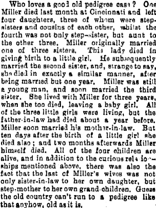 Who loves a good old pedigres cast ? Ona Miller died last month at Cincinnati and left four daughters, three of whom were stepsisters and cousins of each other, whilst the fourth was not Only step-sister, but aunt to the other three. Miller originally married one of three eiatera. This lady died in giving birth to a little girl. He subsequently married the second eister, and, strange to say, she died in exactly a similar manner, after being married but one year. Miller was still e young man. and soon married the third sister, She lived with Miller for three years, when she too died, leaving a baby girl, All of the three little girls were living, but the father-in-law had died about a year before. Miller soon married his mothsr-in-law. But ten days after the birth of a little girl she died also ; and two months afterwards Miller himself died. AU of the four children are alive, and in addition to the curious rela io - ships mentioned above, there was also the fact that the last of Miller's wives was not only sister-in-law to her own daughter, but step-mother to her own grand children. Guess tbe old country can’t run to a pedigree like that anyhow, old as it is,