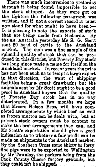 There was much inconvenience yesterday through it being found, impossible to get the stock shipped. As they were got on the lighters the following paragraph was writtan, and if not a correct record it must now stand for what ought to have been I<i is pleasing to note the exports of stock that are being made from Gisborne. By the s.s. Australia yesterday Mr G. G. Scott sent 20 head of cattle to the Auckland market. The mob was a fine sample of the splendid quality of stock that can ba produced in this district, but Poverty Bay stock has long since made a name for itself on the Auckland market. In recent years the price has not been such as to tempt a large export in that direction, the want of shipping facilities being a great drawback j but the animals sent by Mr Scott ought to be a good proof to Auckland buyers that the quality of Poverty Bay stook has in no way deteriorated. In a few months we hops that Messrs Nelson Bros, will have completed arrangements by which beef as well as frozen mutton can be dealt with, but at present stock owners must be content to make the best arrangements they can, and Mr Scott’s exportation should give a good indication as to whether a fair profit can be made on shipments to the Auckland market. By the Southern Cross some thirty to forty flue pigs were to be exported to Wellington by Mr Townley, the porkers being from the Cook County Cheese factory grounds, but thajr eoald not be shipped.