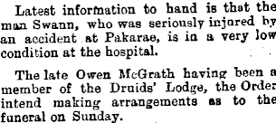 Latest information to hand is that the man Swann, who was seriously injured by an accident at Pakarae, is in a very low condition at the hospital. The late Owen McGrath having been a member of the Druids’ Lodge, the Order intend making arrangements as to the funeral on Sunday.