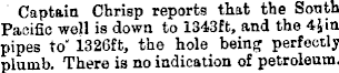 Captain Chrisp reports that the Sonth Pacific well is down to 1343 ft, and the 4Jin pipes to 1326 ft, the hole being perfectly plumb. There is no indication of petroleum.