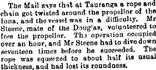 The Mail says that at Tauranga a rope and chain got twisted around the propellor of the lona, and the vessel was in a difficulty. Mr Steene, mate ot the Douglas, volunteered to free the propellor. Th? operation occupied over an hour, and Mr Steene had to dive down seventeen times before he succeeded. The rope was squeezed to about half its usual thickness, and had lost its roundness.