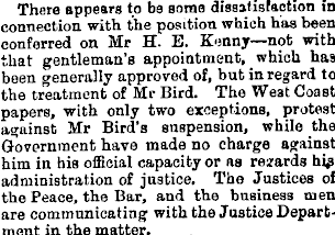 There appears to be some dissatisfaction in connection with the position which has been conferred on Mr H. E. Kenny—not with that gentleman’s appointment-, which has been generally approved of, but in regard to the treatment of Mr Bird. The West Coast papers, with only two exceptions, protest against Mr Bird’s suspension, while the Government have made no charge against him in his official capacity or as regards hip administration of justice. Tho Justices of the Peace, the Bar, and the business men are communicating with the Justice Department in the matter.