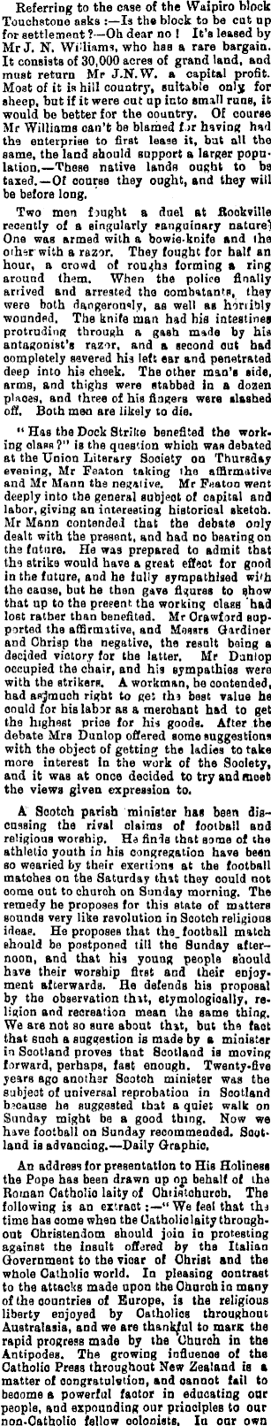 Referring to the case of the Waipiro block Touchstone asks Is the block to be cut up for settlement ?--Oh dear no 1 It’s leased by Mr J. N. Williams, who has a rare bargain. It consists of 30,000 acres of grand land, and must return Mr J.N. W. a capital profit. Most of it is hill country, suitable onlj for sheep, but if it were cut up into small runs, it would be better for the country. Of course Mr Williams can’t be blamed fir having had the enterprise to first lease it, but all the same, the land should support a larger population.—These native lands ought to be taxed.—Of course they ought, and they will be before long. Two men frught a duel at Rockville recently of a singularly sanguinary nature' One was armed with a bowie-knife and the other with a razor. They fought for half an hour, a crowd of roughs forming a ring around them. When the police finally arrived and arrested tho combatants, they were both dangerously, as well as horribly wounded. The knife man had his intestines protruding through a gash made by his antagonist's razor, and a second out bad completely severed his left ear and penetrated deep into his cheek. The other man's side, arms, and thighs were stabbed in a dozen places, and three of his fingers were slashed off. Both men are likely to die. “ Has the Dock Strike benefited the working class?” is the question which was debated at the Union Literary Society on Thursday evening, Mr Featon taking ihe affirmative and Mr Mann the negaiive. Mr Featon went deeply into the general subject of capital and labor, giving an interesting historical sketch. Mr Mann contended that the debate only dealt with the present, and had no bearing on the future. He was prepared to admit that the strike would have a great effect for good in the future, and he fully sympathised wi>h the cause, but he then gave figures to show that up to the present the working class had lost rather than benefited. Mr Crawford supported the affirmative, and Messrs Gardiner and Chrisp the negative, the result being a decided victory for the latter. Mr Danlop occupied the chair, and his sympathies were with the strikers. A workman, he contended, had asjmueh right to get ths best value he could for bis labor as a merchant had to get the highest price for his goods. After tbe debate Mrs Dunlop offered some suggestions with the object of getting the ladies to take more interest in the work of the Society, and it was at once decided to try and meet the views given expression to. A Scotch parish minister has been discussing the rival claims of football and religions worship. Ha finis that some of the athletic youth in his congregation have been so wearied by their exertions at the football matches on the Saturday that they could not oome out to church on Sunday morning. The remedy be proposes for this state of matters Bounds very like revolution in Scotch religious ideas. He proposes that the. football match should ba postponed till the Sunday afternoon, and that his young people should have their worship first and their enjoyment afterwards. He defends his proposal by the observation that, etymologically, religion and recreation mean ths same thing. We are not so sure about that, but the fact that such a suggestion is made by a minister in Scotland proves that Scotland is moving forward, perhaps, fast enough. Twenty-five years ago another Scotch minister was the subject of universal reprobation in Scotland bicause he suggested that a quiet walk on Sunday might be a good thing. Now we have football on Sunday recommended. Scotland is advancing.—Daily Graphic. An address for presentation to His Holiness the Pope has been drawn up op behalf of the Roman Catholic laity of Christchurch. The following is an extract" We feel that ths time has come when tbe Catholic laity throughout Christendom should join in protesting against the insult offered by the Italian Government to the vicar of Christ and tbe whole Catholic world. In pleasing contrast to the attacks made upon tbeOhurohin many of the countries of Europe, is the religious liberty enjoyed by Catholics throughout Australasia, and we are thankful to mars tbe rapid progress made by the Church in tbe Antipodes. The growing influence of the Catholic Press throughout New Zealand is a matter of congratulation, and cannot fail to become a powerful factor in educating our people, and expounding our principles to our non-Catholio fellow colonists. In oar own