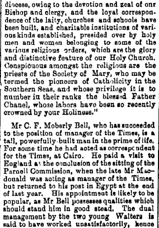 diocese, owing to the devotion and zeal of onr Bishop and clergy, and tbe loyal correspondence of the laity, churches and schools have been built, and charitable institutions of various kinds established, presided over by holy men and woman belonging to some ot the various religious orders, which are the glory and distinctive feature of our Holy Church. Conspicuous amongst the religious are the priests of the Society of Mary, who may be termed the pioneers of Catholicity in the Southern Seas, and whose privilege it is to number itt their ranks the blessed Father Chanel, whose labors have been so recently crowned by your Holiness." Mr C. F. Moberly Bell, who has succeeded to the position of manager of the Times, is a tall, powerfully built man in the prime of life. For some time he had acted as oorrespendent for the Times, at Cairo. He paid a visit to England at the conclusion of the sitting of the Parnell Commission, when the late Mr Macdonald was acting as manager of the Times, but returned to his post in Egypt at the end of last year. His appointment is likely to be popular, as Mr Bell possesses qnalities which should stand him in good stead. The dual management by the two young Walters is said to have worked unsatisfactorily, hence