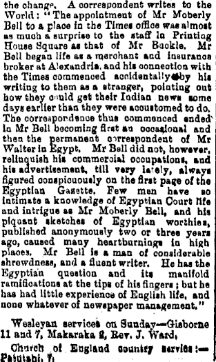 the change. A correspondent writes to the World: “ The appointment of Mr Moberly Bell to a place in the Times office was almost as much a surprise to the staff In Printing House Square as that of Mr Buckle. Mr Bell began life as a merchant and insurance broker at Alexandria, and hie connection with the Times commenced acaidentaUyftby his writing to them as a stranger, pointing out how they o >uld get their Indian news tome days earlier than they were accustomed to do. The correspondence thus commenced ended' la Mr Bell becoming flrat an ocoaalonal and then the permanent correspondent of Mr Walter in Egypt. Mr Bell did not, however, relinquish his commercial occupations, and his advertisement, till very la'ely, always figured conspicuously on tha first page of the Egyptian Gazette, Few men have so intimate a knowledge of Egyptian Court life and intrigue as Mr Moberly Bell, and his piquant sketches of Egyptian worthies, published anonymously two or three years ago, caused many heartburnings in high places. Mr Bell la a man of considerable shrewdness, and a fluent writer. He has the Egyptian question and its manifold ramifications at the tips of his fingers; but be has had little experience of English life, and none whatever of newspaper management,” Wesleyan service* on Sunday—Gisborne 11 and 7, Mak&raka 2, Rev. J. Ward, Church of England country tirvitsi— Patutahi, 7i