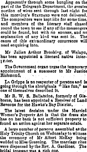 Apparently through some bungling on the part of the Telegraph Department, the greater portion of wires eent through last night for this morning’s Standabd were not delivered. The compositors were kept idle for sometime, and members of the literary staff chased round the town to see if any of the messengers could be found, but with no success, and no explanation of any kind was sent in. The cause of this extraordinary occurrence will need enquiring into. Mr Julien Arthur Brooking, of Waiapu, has been appointed a licensed native interI rater. The Government organ urges the temporary appointment of a euocassor to Mr justice Richmond, La Grippe is no respecter of persons and is going through the aboriginals “ like fun," as one of themselves described it, Mr R. W. 8. Ballantine, formerly of Gisborne, has been appointed a Receiver of Land Revenue for the Hawks’s Bay District. The latest decision under the Married Women’s Property Act is that the dress she has on her back is not sufficient property to found an action against her separate estate. A large number of persons assembled at the Holy Trinity Church on Wednesday to witness the ceremony of Mr Albert McKay being wedded to Mies Greening. The marriage rites were dispensed by tbe Rev. A. Gardiner. The bridal trosseau was a rich one.