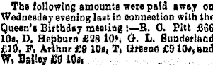 Tbe following amounts were paid away on Wednesday evening last in connection with the Queen’s Birthday mealingß. C. Pitt £66 10a, D. Hepburn £2B 10«, G. L. Sunderland £l9. F. Arthur £9 10a, T, Greene £9lo*, and W, Bailey 42010 a,