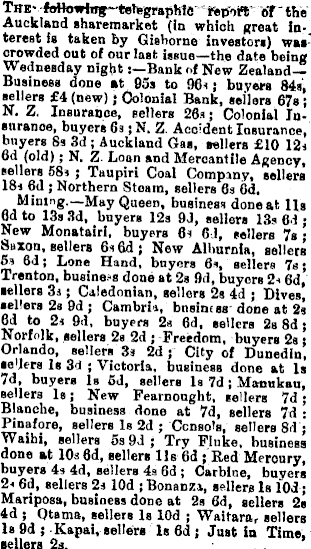 The following telegraphic report of the Auckland sharemarket (in which great interest is taken by Gisborne investors) was crowded out of our last issue—the date being Wednesday nightßank of New Zealand— Business done at 95s to 9G<; buyers 84s, sellers £4 (new); Colonial Bank, sellers 67s ; N. Z. Insurance, sellers 265; Colonial Insurance, buyers 6s ; N. Z. Accident Insurance, buyers 8s 3d ; Auckland Gas, sellers £lO 12s 6d (old); N. Z Loan and Mercantile Agency, sellers 58s ; Taupiri Coal Company, sellers 18s 6d ; Northern Steam, sellers 6s 6d. Mining.—May Queen, business done at Ils fid to 13s 3d, buyers 12s 9J, sellers 13s 61 ; New Monatairi, buyers 6s 61, sellers 7e ; Saxon, sellers 6s 6d; New Alburnia, sellers 5s 6d ; Lone Hand, buyers 6s, sellers 7s; Trenton, business done at 2s fid, buyers 2a 6d, sellers 3s; Caledonian, sellers 2s 4d ; Dives, sellers 2s fid ; Cambria, business done at 2s 6d to 2a fid, buyers 2s 6d, sellers 2s 8d; Norfolk, sellers 2s 2d ; Freedom, buyers 2s; Orlando, sellers 3s 2d ; City of Dunedin, sellers Is 3d ; Victoria, business done at Is 7d, buyers Is sd, sellers la 7d ; Manukaa, Bellers Is; New Fearnought, sellers 7d; Blanche, business done at 7d, sellers 7d : Pinafore, Bellers la 2d ; Ccnso's, Beilers B<l ; Waihi, sellers 5s 9.1 ; Try Fluke, business done at 10s 6d, sellers Ils 6d ; Red Mercury, buyers 4s 4d, sellers 4s 6d ; Carbine, buyers 2< 6d, sellers 2s lOd ; Bonanza, sellers Is lOd; Mariposa, business done at 2s 6d, sellers 2s 4d ; Otama, sellers Is lOd ; Waitara, sellers Is 9d ; Kapai, sellers Is 6d ; Just in Time, sellers 2s.