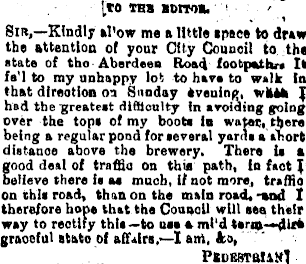 [TO THE KDITOa. Sir,—Kindly al'ow me a little space to draw the attention of your City Council to the state of the Aberdeen Road footpath. It fe’l to my unhappy lot to hava to walk in that direction on Sunday evening, wbSa J had the greatest difficulty in avoiding going over the tops of my boots in water, there being a regular pond for several yards a abort diatance above the brewery. There is a food deal of traffic on this path, in fact I lelieve there is as much, if not more, traffic on this road, than on the main road, and I therefore hope that the Council will see their way to rectify thia—to use a ml'd term—dies graceful state of affaire,—l am, &o, PtoffirrafANl