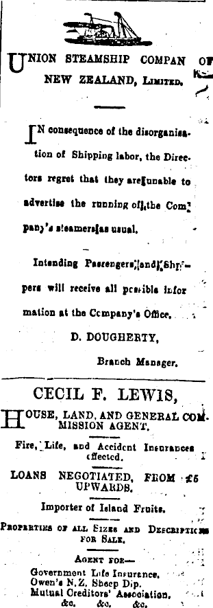 jjnion steamship compan or NEW ZEALAND, Limitzd, |~N conseqaence of the disorganisation of Shipping labor, the Directors regret that they arefunable to advertise the running ofJ.the ComJ panj’i sleamers|as usual. Intending Paerengera;[and)'6bf '- pers will receive all pcetible Infor mation at the Ccmpany's Office. D. DOUGH EBTY, Branch Manager. CECIL E. LEWIS, House, land, and general commission agent. Fire, Life, and Accident Insurances effected. LOANS NEGOTIATED, FROM £5 UPWARDS. Importer of leland Fruits. PaorxuTiEs or all Sizes abd Dcscbiftxcm fob Sale. Ausnt fob— Government Life Inrurcnce. Owen's N.Z, Sheep Dip. Mutual Creditors' Association. &c. Ao. Ac.
