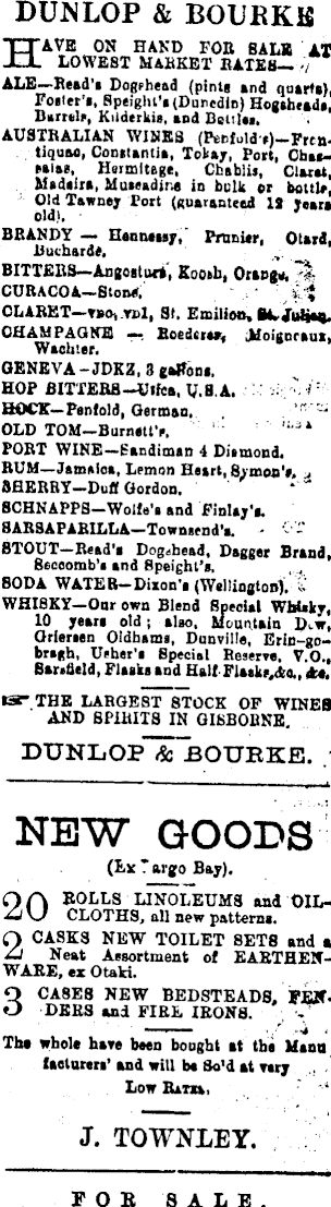 DUNLOP & BOURKE Have on hand fob sale at lowest market rates— ALE—Read's Dogehead (pints and quarts), Foster's, Speight’s (Dunedin) Hogsheads, Barrel,, Kilderkie, and Bettles, AUSTRALIAN WINES (Penfold,)—Frentiquao, Constantia, Tokay, Port, Chassatsß, Heimltage, Chablis, Clarsi, Madeira, Museadir.e in bulk or bottle, Old Tawney Port (guaranteed 12 years old). BRANDY — Hennessy, Pranier, Otard, Bucharde, BlTTEBS—Angostura, Kootb, Orange, CURACOA—Stons. CLABET— v»o, vol, St. Emilion, SA Julien. CHAMPAGNE — Roederer, .Moigncaux, Wachter. GENEVA-JDKZ, 3 gallons. HOP BITTEBB—Utica, U.S.A. HOCK—Penfold, German, OLD TOM—Burnett',, POBT WlNE—Sandiman 4 Diamond. BUM—Jamaica, Lemon Heart, Symon'e. 3HEBBY—Duff Gordon. SCHNAPPS—WoIfe's and Finlay's. SARSAPARILLA—Townsend's. STOUT—Read's Dogehead, Dagger Brand, Seccomb’a and Speight’s. SODA WATER—Dixon's (Wellington). WHISKY—Our own Blend Special Whisky, 10 years old; also, Mountain DIW, Grieraen Oldhams, Dunville, Erin-go-bragh, Usher’s Special Reserve. V. 0., Sar.fleld, Flasks and Half Flasks.dro., As. ts- THE LARGEST STOCK OF WINES AND SPIRITS IN GISBORNE. DUNLOP&BOUBKE. NEW GOODS (Ex ’ argo Bay). 0A ROLLS LINOLEUMS and OILCLOTHS, all new patterns. 0 CASKS NEW TOILET SETS and a Neat Assortment of EARTHENWARE, ex Otaki. 3 CASES NEW BEDSTEADS, FENDERS and FIRE IRONS. The whole have been bought at the Menu taeturers’ and will be fin'd at very Low Rates, J. TOWNLEY. FOB SALE.