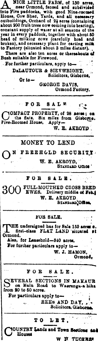 AMICE LITTLE FARM, of 150 acres, near Ormond, fenced and subdivided into Five paddocks, with good Nine-rootaed Hones, Cow Shod, Yards, and all necessary outbuildings. Orchard of 2} acres (containing about 200 fruit trees now coming into bearing), constant supply of water at all seasons of the Sear in every paddock, together with about 50 ead of milking cows (carefully bred and broken), and necessary plant tor carting milk to Factory (situated about 3 miles distant). There are also ten acres or thereabouts of Bush suitable for Firewood. For further particulars, apply to— DxLAUTOUB A BIEVWRIGHT, Solicitors, Gisborne, Or to— GKOBGE DAVIS, Ormond Factory. FOR SALE. COMPACT PROPERTY, of 28 acres; on the flats. Six miles from Gisborne. Five-Boomed House, Apply— W. E. AKBOYD MONEY TO LEND QN FREEHOLD SECUBIT.I W. E. AKBOYD, Standard Utncs FOB SALE. Of tri FULL-MOUTHED CROSSBRED OLzky EWES. Delivery middle of Feb-| W. E. AKBOYD StAXDABDjOffIM, FOB SALE. THE undersigned has for Sals 150 acres 0. first-class FLAT LAND situated st Ormond. Also, for Leasehold—34o acres, For further patticulars apply to— W. J. HAMON, Ormond, FOB SALE. SEVERAL SECTIONS IN MA KA UR on Main Road to Waerenga-a hike from 20 to 50 acres. For particulars apply to— REEb AND DAY, Solicitors, Gisborne. TO LET, COUNTRY Lands and Town Sections Mti HouiM W F TUCKRRs