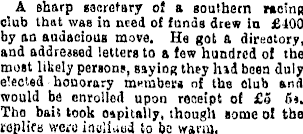 A sharp secretary of a southern racing club that was in need of funds drew iu £4OO by an audacious move. He got a directory, and addressed letters to a few hundred of tbe most likely person?, saying they had been duly elected honorary members of the club and would be enrolled upon receipt of £5 6s. The bait took capitally, though some of the replied were inuliued to be warm.