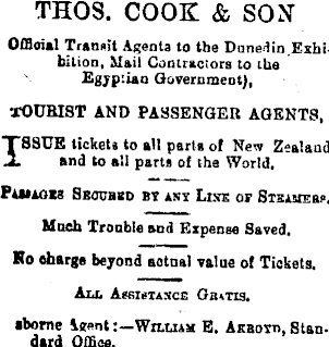 THUS. COOK & SOX Official Transit Agents to the Dunedin Exhibition, Mail Contractors to the Egyptian Government), •.TOURIST and passenger agents, ISSUE tickets to all parts of New Zealand and to all parts of the World, Passages Secured by any Line of Steamer?. Much Trouble and Expense Saved, No charge beyond actual value of Tickets, All Assistance Gratis, ■borne Agent William E. Aeroyd, Standard Office.