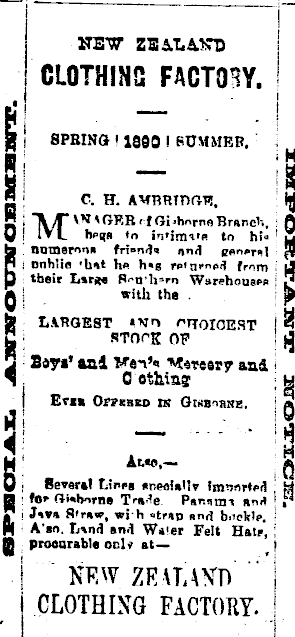 I NEW ZBA.LA.NT3 CLOTHING FACTORY. ' 1 ~ B SPRING 1 1090 I SUMMER. J - C. H. AMBRIDGE, Ijj S XT Branch, A V H hpgs fn infimve tn hfa y taj numerous frfand’ and eenprel S R nnh’ie ’hat he h«g returned from u their Large R''U'!i"rn Warehouses : A with the 2 LARGEST INH CHOICEST 12 STOPS OF g . Bays’ aal L'fen’- andl 0 Otting y Evas OrFsBBD is Gt.3->r>Nß. a 5 - M Amp,- g V Several Lmra .neol.Rv Imported H B for Gi.hnrne T'-a’e P»n smi n-rf H r Java R'r.w, wi h .trap .nd bneklp. R A .n, Land and W.'er Felt Hate, procurable only at— i NEW ZEALAND i CLOTHING FACTORY.