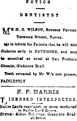 NOTICE DENTISTRY H. 0. WILSON, Bcnoxox Dsktmt, Tbkhwox Srsßsr, N.vrsn, egi to inform bi, Pa'ienta that be will visit Gisborne early ia NOVEMBER, and may be oonsalted as usual at Gso. Fosisb’s Chemist, Gladstone Bead. Teeth extracted by Mr W.’a new process, PAINLESSLY E. F. HARBIS T ICENSED INTERPRETER, Native Lande negotiated, or cs»m aondueted in Native Lard On'jrta, Omta: Aiiu'oi; Buildings, Gladstone Road •aii beYne,