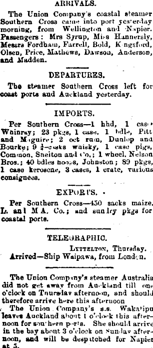 ARRIVALS. The Union Company's coastal steamer Southern Cross came into port yesterday morning, from Wellington and Napier. Passengers : Mrs Syrup, Mi.-s Hannersly, Messrs Fordham, Farrell, Bold, K ngsford, Olsen, Price, Mathews, Dawson, Anderson, and Madden. DEPARTURES. The steamer Southern Cross left for coast ports and Auckland yesterday. IMPORTS. Per Southern Cross—l hhd, 1 cas^» Wninray; 23 pkgs, 1 case, 1 t«dle, Pitt and Miguire; 2 oct run, Dunlop and Bourke; 9 whisky, 1 case pigs, Common. Sneiton and <’o.; 1 wheel. Nelson Bros.; 40 bdles hoops, Johnston; 89 pkgs, 1 case kerosene, 3 cases, 1 crate, various consignees. EXPORTS. • Per Southern Cross—4so sacks maize. L. an I MA, Co.; and siinlry pkgs for coastal ports. TELEGRAPHIC. Lyttelton, Thursday. Arrived—Ship Waipawa, from Louden. The Union Compiny’s steamer Australia did not get away from Au-kland till one o’clock on Tnursdav afternoon, and should therefore arrive here this afternoon The Union Company’s s.s. WakaHpu leaves Auckland about i o’<do.-k this afternoon for sou 1 hem p -rts. She should arrive in the bay about 3 o’clock on Sundav afternoon, and will be desp itched for Napier at 5.
