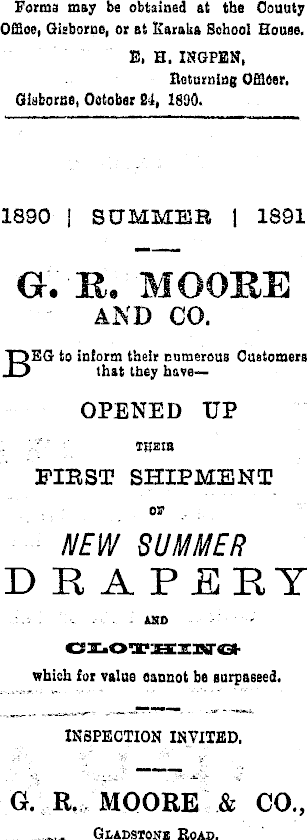 Forms may be obtained at tho Couuty Office, Gisborne, or at Karaka School House. E, H. INGPEN, Returning Officer. Gisborne, October 24, 1890. 1890 | SUMMER | 1891 G. B. MOOKE AND CO. BEG to inform their numerous Customers that they have— OPENED UP THEIB FIRST SHIPMENT or NEW SUMMER DBA PERY AND CSK.O’OCaEEXBSTG!which for value cannot be surpassed. INSPECTION INVITED. G. R. MOORE & CO., Gladstone Road.