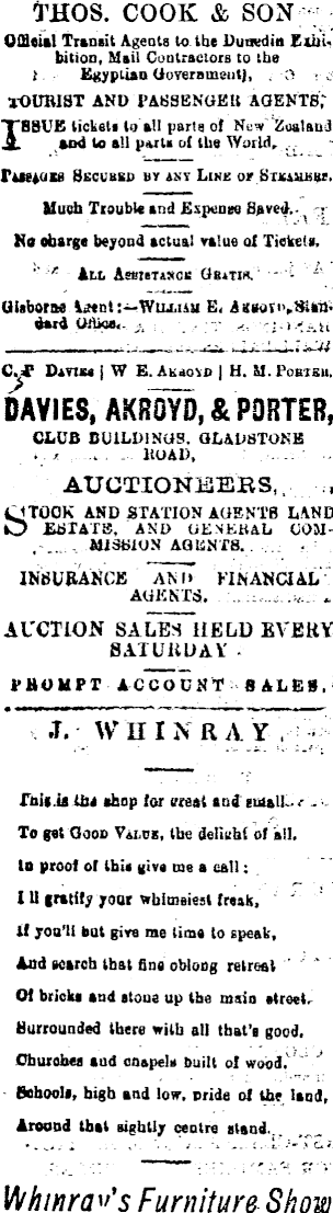 THOS. COOK & SON Official Transit Agents to the Vuuedin Eiiiibition, Mail Contractors to the Egyptian Government), XOUBJBT AND PASSENGER AGENTS, ISSUE ticket, to all parte of New Zealand and to all parti of the World. PiM*nan BitccKm by xnv Line of SrEwsas. Much Trouble and Espouse Saved. No charge beyond actual value of Tickets. All Assistance Gbatih. Gisborne LicntWilliam E. Aaaoi<>.%*ncard Office. , - ■ C.F Dinu | W E. Aaaoin | H. M.Pobibu. DAVIES, AKROYD.& PORTER, CLUB BUILDINGS. GLADSTONE HO AD. AUCTIONEERS. h«TOCK AND STATION AGENTS LAND O ESTATE. AND GENERAL com MISSION AGENTS. INSURANCE ANh FINANCIAL AGENTS. AUCTION SALES HELD EVERY SATURDAY PROMPT ACCOUNT SALEH. .T. WIII N R A Y , Tnic is llio chop lor crest and small To get Goon Vai.cz, the delink! of all. In proof of this give me a call: 111 gratify your whimsies! freak. It you'll but give me time to epeak, Aud search that tine oblong retreat Of brick, aud stone up the main street. Surrounded there with all that’e good. Churches aud cnapel. built of wood. Schools, high and low, pride of the lend. Around that sightly centre stand Whinra''’s Furniture Show