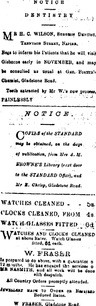 NOTICE DENTISTRY B H. C. WILSON, Sobobon Dcntibt, TaSKIbON S-tBIiKT, NiriKß, Begs to inform bis Patients that he will visit Gisborne early in NOVEMBER, and may be consulted as usual at Geo. Fosteb’m Chemist, Gladstone Boa J. Teeth extracted by Mr W.'s now process, PAINLESSLY notice. QOPU.S of the STANDARD map be obtaHK’d, ou the day* of oubUeation, from bln J. hl. EROH’NE'S Library (read door «« the STANDARD Office), and Air R. Chrisp, Giadelvne Read. WATCHES CLEANED - - b 3. CLOCKS CLEANED, EROM J 3 WATCH-GLASSES FITTED 6d WATUUEB AND CLOCKS CLEANED it above Ra<*ee. Watch Glares fitted, SA each. W. FRASER Is prepared to do above, with a guarantee o He has engaged ths services o MR NASMITH, and all work will be done »ilh despatch. All Country Orders promptly attended. dCWZLLaax MAI'S TO Ont'Eß OB BtUiIBSD Reduced Rates. W FRASER, Gladstone Road.