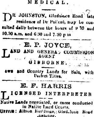 medical. T~yif -IOiINS 1 ON, Uladaivce Road late resitlouii of Dr Poicu), nury Lu consulted daily between the Lours vf l> 50 end 10.30 a.m, and 630 and 7.30 p m E. P. JOYCE, Land and genera. commission AGENT GISBORNE, CWB and Country Lands for Sala, wi’h Perfect Titles. B. F. HARRIS ICENBED INTERPRETER Natitt Land, negotiated, or cases oondueted in Native Land Gcurte. UltlVt 1 Albion fcoHdirgw, UtaLtoM Road Jisbcrnr,