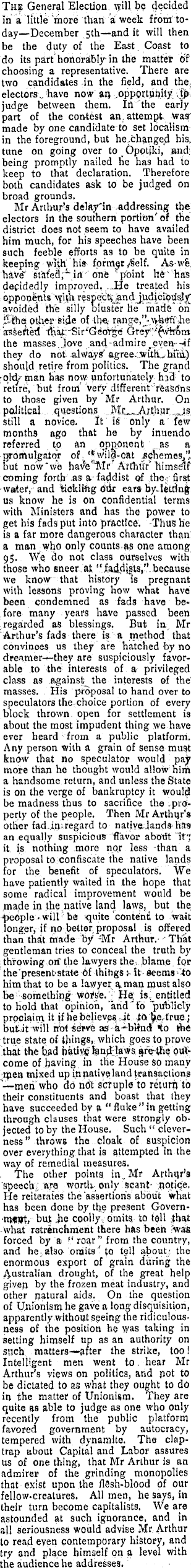 The General Election will be decided in a little more than a week from today—December 5th —and it will then be the duty of the East Coast to do its part honorably in the matter of choosing a representative. There are two candidates in the field, and the electors have now an opportunity to judge between them. In the early part of the contest an attempt was' made by one candidate to set localism in the foreground, but he changed his, tune on going over to Opotjki, and being promptly nailed he has had to keep to that declaration. Therefore both candidates ask to be judged on broad grounds. Mr Arthur’s delay in addressing the electors in the southern portion of the district does not seem to have availed him much, for his speeches have been such feeble efforts as to be quite in keeping with his former /self. As we have stated,* in one point hi has decidedly improved. He treated his opponents with respect, and judiciously avoided the silly bluster he mad 6 on " the other side of the, range,” when he. asserted that Sir George Grey the masses. Jove and admire .even if they do not always agree with, him) should retire from politics. The grand old man has now unfortunately had to retire, but from very different reasons to those given by Mr Arthur. On political questions Mr Arthur is still a novice. It is only a few months ago that he by inuendo referred to an opponent as a promulgator of “ wild-cat schemes,’’ but now'we have Mr Arthur'himself coming forth as a faddist of the first water, and tickling Oiir ears by letting us know he is on confidential terms with Ministers and has the power to get his fads put into practice. Thus he is a far more dangerous character than a man who only counts as one among g;. We do not class ourselves with those who sneer at “ faddists,” because we know that history is pregnant with lessons proving how what have been condemned as fads have before many years have passed been regarded as blessings. But in Mr Arthur’s fads there is a method that convinces us they are hatched by no dreamer—they are suspiciously favorable to the interests of a privileged class as against the interests of the masses. His proposal to hand over to speculators the choice portion of every block thrown open for settlement is about the most impudent thing we have ever heard from a public platform. Any person with a grain of sense must know that no speculator would pay more than he thought would allow him a handsome return, and unless the State is on the verge of bankruptcy it would be madness thus to sacrifice the property of the people. Then Mr Arthur’s other fad in regard to native lands has an equally suspicious flavor about it /;' it is nothing more nor less than a proposal to confiscate the native lands for the benefit of speculators. We have patiently waited in the hope that some radical improvement would be made in the native land laws, but the -people will be quite content to wait longer, if no better proposal is offered than that made by : Mr Arthur. That gentleman tries to conceal the truth by throwing on the lawyers the blame for the present-state of things: it seems to him that to be a lawyer a. man must also be something worse. He is entitled to hold that opinion, and to publicly proclaim it if he believes it to be true; _ but it will not serve as a-blind Ho the true state of things, which goes to prove that the bad native land laws tire the outcome of having in the House so many men mixed up in native land transactions —men who do not scruple to return to their constituents and boast that they have succeeded by “ fluke”in getting through clauses that were strongly objected to by the House. Such “ cleverness” throws the cloak of suspicion over everything that is attempted in the way of remedial measures. The other points in Mr Arthur’s speech are worth only scant notice. He reiterates the assertions about what has been done by the present Governmeßt, but .he coolly omits to toll that what retrenchment there has been was [forced by a roar” from the country, and he also omits to tell about the enormous export of grain during the /Australian drought, of the great help given by the frozen meat industry, and other natural aids. On the question of Unionism he gave a long disquisition, apparently without seeing the ridiculousness of the position he was taking in setting himself up as an authority on such matters—after the strike, too 1 Intelligent men went to hear Mr Arthur's views on politics, and pot to be dictated to as what they ought to do in the matter of Unionism. They are quite as able to judge as one who only recently from the public platform favored government by autocracy, tempered with dynamite. The claptrap about Capital and Labor assures us of one thing, that Mr Arthur is an admirer of the grinding monopolies that exist upon the flesh-blood of our fellow-creatures. All men, he says, in their turn become capitalists. We are astounded at such ignorance, and in all seriousness would advise Mr Arthur to read even contemporary history, and try and place himself on a level with the audience he addresses.