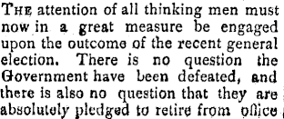The attention of all thinking men must now in a great measure be engaged upon the outcome of the recent general election. There is no question the Government have been defeated, and there is also no question that they are absolutely pledged to retire from office