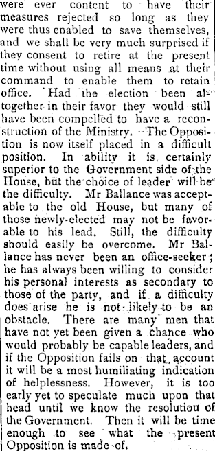were ever content to have their measures rejected so long as they were thus enabled to save themselves, and we shall be very much surprised if they consent to retire at the present time without using all means at their command to enable them to retain office. Had the election been altogether in their favor they would still have been compelled to have a reconstruction of the Ministry. The Opposition is now itself placed in a difficult position. In ability it is certainly superior to the Government side of the House, but the choice of leader will be the difficulty. Mr Ballance was acceptable to the old House, but many of those newly-elected may not be favorable to his lead. Still, the difficulty should easily be overcome. Mr Ballance has never been an office-seeker ; he has always been willing to consider his persona) interests as secondary to those of the party, and if a difficulty does arise he is not likely to be an obstacle. There are many men that have not yet been given a chance who would probably be capable leaders, and if the Opposition fails on that... account it will be a most humiliating indication of helplessness. However, it is too early yet to speculate much upon that head until we know the resolution of the Government. Then it will be time enough to see what the present Opposition is made of.