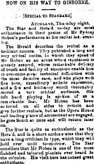 NOW ON HI3 WAY TO GISBORNE, fSPECUL to Standard] Auckland, Thumday night. The Star and Herald to-day are most enthusiastic in tbe.r praise oi Mr Sydney Hoben’s performance at his recital 1.8. avenii'g. The Herald describee the recital a. a brilliant success. They published a long and very cri’ical notice, in which they apeak ot Mr Hoben ae an artist wtro-e reputation la already assured, whose remarkable delicacy of touch and feci ity of axecutioo enable him to overcome great technical difficulties with the most delusive ease, and who playa with fine time, exceedingly artistic expression, and a fire and brilliancy which thoroughly moved a very critical audience. His left hand plcying ie spoken 0! as a remarkable feai. Mr Hobeu has been so iolted on all sides to remain and give further recitals, but as the Opera Hou-e and leading p aces of amusement are engaged, he goes South at once and will return later on. The Star is quite as enthusiastic as the Hera d. and iu a short notice a-ates that they have a long criticism in type, which they wid hold over until to-mnrrow. The Star considers that Mr Hobeu is one of the most finished and talented pianists ever heard iu the colonies. Hia visit here has caused great enthusitwin,