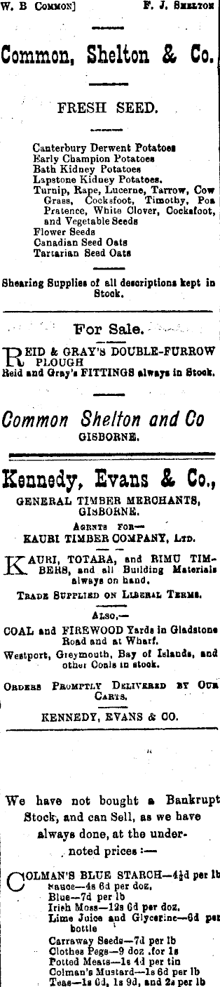 W. B Common] F. J. Smutoh Common, Shelton & Co. FRESH SEED. Canterbury Derwent Potatoes Early Champion Potatoea Bath Kidney Potatoes Lapstone Kidney Potatoes. Turnip, Rape, Lucerne, Tarrow, Cow Grass, Cocksfoot, Timothy, Poa Pratence, While Clover, Cocksfoot, and Vegetable Seeds Flower Seeds Canadian Seed Oats Tartarian Seed Oats Shearing Supplies of all descriptions kept in Stock. For Sale. Beid & gray’s'double-furrow PLOUGH Reid and Gray's FITTINGS always in Stock. Common Shelton and Co GISBOBNE. Kennedy, Evans & Co., GENERAL TIMBER MERCHANTS, GISBOBNE. Aubnts fob— KAURI TIMBER COMPANY, Lid. Kauri, totaba, and rimu timbers, and all Building Materials always on band. Tbadz SvrrttKD on Lueuul Txbmi. Also,— COAL ami FIREWOOD Yards in Gladstone Road and at Wharf, Westport, Gieymouth, Bay ot Islands, and other Coals id stock. Obdkks PbombtlV Delivered by Ora Cams. KENNEDY, EVANS & CO. We have not bought a Bankrupt Stock, and can Sell, as we have always done, at the undernoted prices : — COLMAN’S BLUE STARCH—4.Jd pet lb Nauoe—4s 6d per doz. Blue—7d per lb Irish Moss—l2s Gd per doz. Lime Juice and Glycerine—Gd per bottle Carraway Seeds—7d per lb Clothes Pegs—9 doz .for la Potted Meats—ls 4J per tin Colman’s Mustard—ls 6d per lb Teas—ls Gd, Is 9d, and 2. per lb